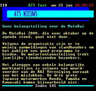 Yamaha neemt niet deel aan MotoRAI 2000 (persbericht Yamaha Motor Nederland BV) Yamaha zal niet deelnemen aan de aanstaande MotoRAI 200 beurs, die gehouden wordt in oktober aanstaande in het RAI-complex te Amsterdam. Yamaha vindt de traditionele, statische wijze van exposeren niet het juiste instrument om een groot publiek voor het motorrijden te enthousiasmeren. Er wordt inmiddels gezocht naar alternatieven voor de gehele motorindustrie die beter passen in het huidige tijdsbeeld en een grootschaliger karakter hebben. Yamaha-dealers en de Nederlandse consumenten zullen middels andere communicatiemiddelen op de hoogte worden gebracht van het motornieuws voor 2001. Het niet deelnemen aan de MotoRAI staat los van de participatie van Yamaha in de RAI-vereniging. Yamaha vindt een optimale samenwerking tussen alle motormerken uitermate belangrijk gezien de vele uitdagingen voor de motorindustrie. De MotoRAI 2000, die voor oktober op de agenda stond, gaat niet door. Volgens de organisatie zijn er te weinig standhouders om het publiek een goed programma te bieden. De motortentoonstelling trekt jaarlijks tienduizenden bezoekers. Het afzeggen van enkele belangrijke marktpartijen is volgens een woordvoerder van de RAI Vereniging oorzaak van het mislukken. De drie grote Japanse motormerken Honda, Yamaha en Kawasaki komen bijvoorbeeld niet. De MotoRAI gaat dit jaar niet door omdat volgens de organisatie er te weinig aanmeldingen van standhouders zijn. De tentoonstelling, die jaarlijks tienduizenden bezoekers trekt, zou in oktober worden gehouden. Het afzeggen van enkele belangrijke marktpartijen is volgens een woordvoerder van de RAI vereniging oorzaak van het mislukken. "De drie grote Japanse motormerken Honda, Yamaha en Kawasaki hebben laten weten niet aanwezig te zijn. Hierdoor verminderde ook de interesse van andere potentiele deelnemers." Honda Nederland verklaart voorlopig uitgekeken te zijn op de MotoRAI. Een woordvoerder: "Wij hebben niets gemerkt van nieuwe initiatieven. Het leek erop dat de MotoRAI weer gewoon een plaats zou worden waar je je motoren kunt laten zien aan het publiek. Het is een grote showroom, maar daar hebben we dealers voor. De consument wil entertainment. Yamaha en Kawasaki delen deze mening". |